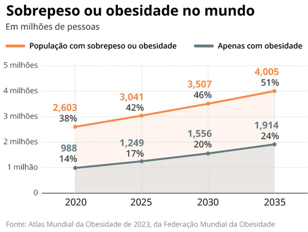 População mundial acima de 5 anos de idade e percentagem com sobrepeso e obesidade.
