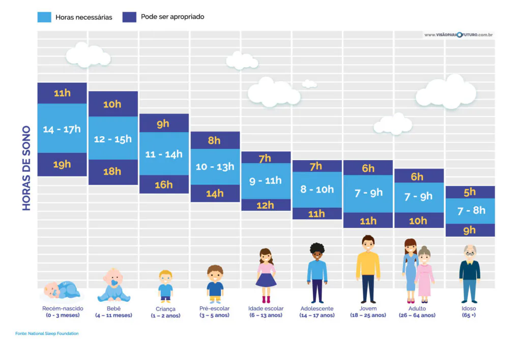 O número de horas necessárias de sono para cada paciente é pessoal, entretanto a média depende da idade conforme o gráfico abaixo.